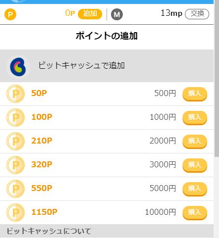 ビットキャッシュを購入すればサクッとポイント追加ができます。