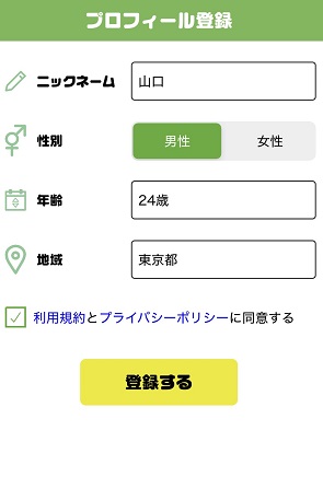 まず、アプリを開くと上記のようなニックネームと年齢などを入力する超簡単なプロフィール作成をします。