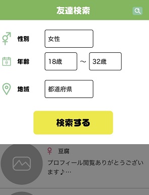 検索は「友達検索」という機能から上記のような簡単な項目で条件指定することができます。