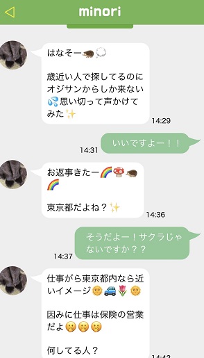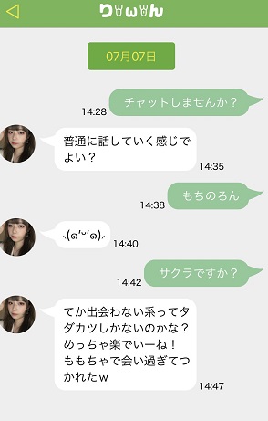 ほとんどがサクラと業者。LINEの方がいいとか言って有料のサイトのURLを送ってくる。LINEのQRコードも送ってくる人がいるけどそれも業者ですね。