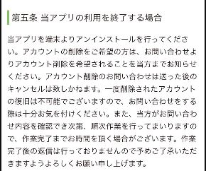 また、アプリのアカウントを完全に削除したい場合は「お問い合わせ」より運営に削除の旨を連絡しなければなりません。