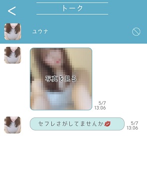1通目から「セフレさがしていませんか?」と送ってくるサクラの女性です。写真を添付しているのも、ポイントを消費させるための誘導ですね。