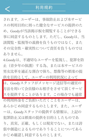 さらに驚いたのは、この利用規約には「グッディのスタッフがメッセージ送信をして相手をさせていただくことがある」という事が明記されていました。
