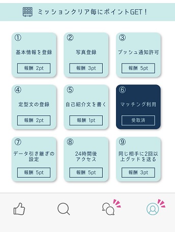 上記のようにプロフィール作成、写真登録、毎日ログインなどを行うことで、ボーナスポイントが付与されます。