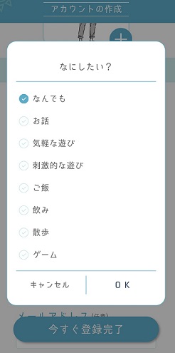 初期の登録時に出会った相手と「どこに行きたい」「なにをしたい」といった質問事項に回答します。