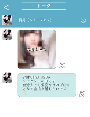 最初のメッセージでツイッターのIDを送ってきた業者の女性。恐らくツイッターでも何かしらの勧誘をされそうですね。