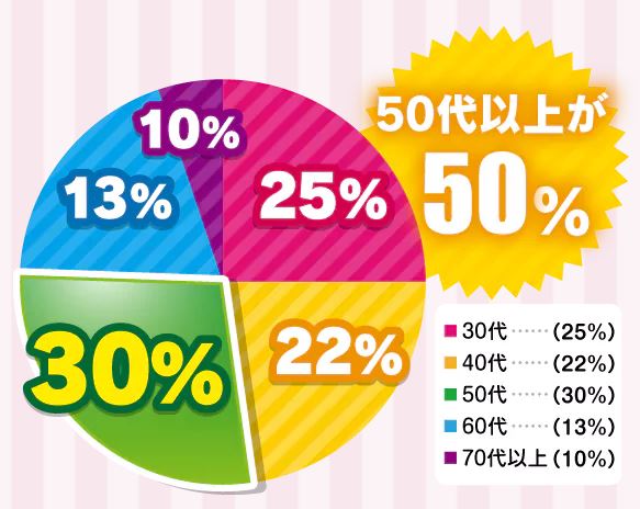 独身、既婚者とわず利用ができることから、40代や50代の方が「飲み友達」や「メル友」「大人の交際」を目的に利用しているケースが多いようです。