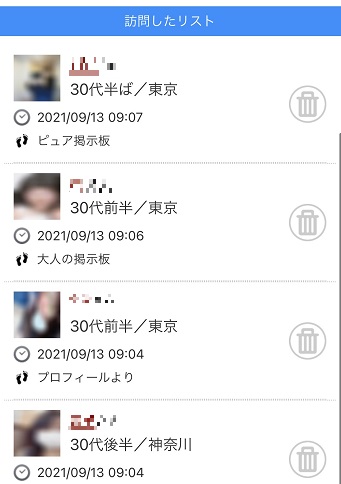 実際に足跡をみてみると、自分のプロフィールに訪問してくれた女性が表示されていますが、ここで大事なのは「どこから経由して訪問したか」という点です!!