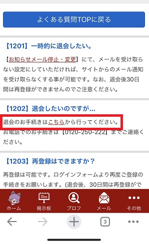まずはサイト下部にある「よくある質問」から「退会のお手続きはこちら」というリンクへと進んでください。