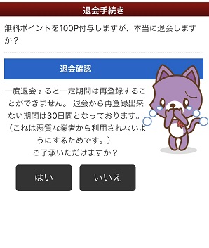 本当に退会をする場合は「はい」を選び、「退会完了」の案内が出るまでしっかり手続きしてください!!