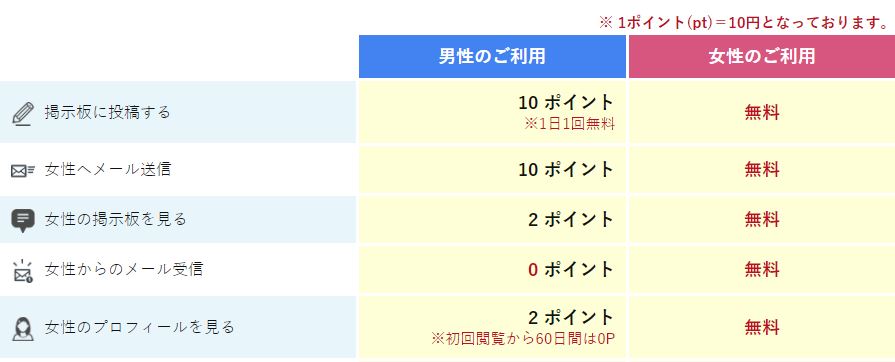 1ポイント10円なので、男性は女性にメッセージを送る場合100円、プロフィールや掲示板を閲覧する場合は20円が消費されます。