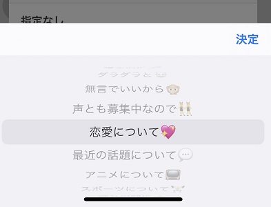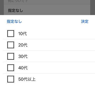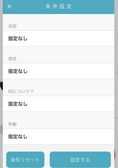 ユーザー検索で条件指定ができるのは「年齢」や「話すテーマ」のみになっています。