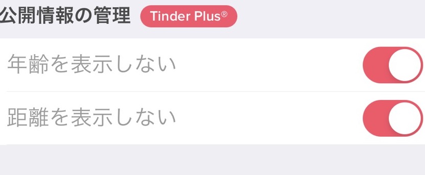 これはtinderプラスという有料会員に課金をしなければなりませんが、プロフ画面の「年齢」と「距離」を隠す設定ができます。