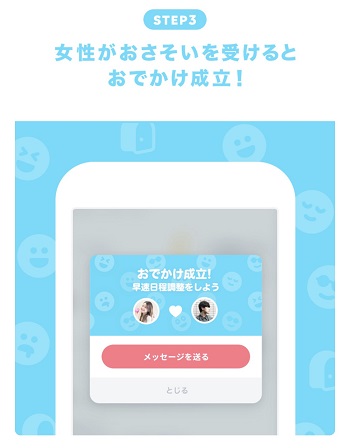 女の子はそんな男性のお誘いの中からお相手を決めて「おでかけマッチングが成立」