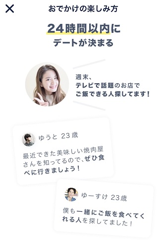 おでかけは通常のマッチング機能とは別に、「女性が24時間以内にデート相手を募集」できるコーナーとなっています。