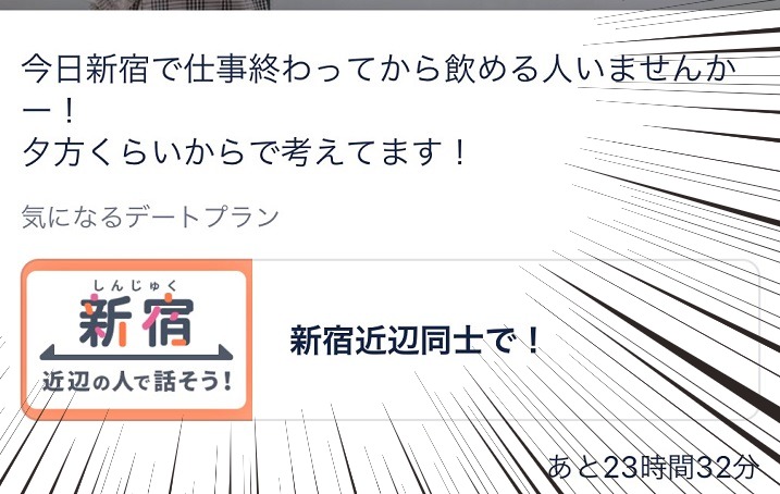 女の子の募集の中には、「今日飲みに行きませんか??」「いま新宿にいる人会いませんか」といったような突発的なお誘いもあります。